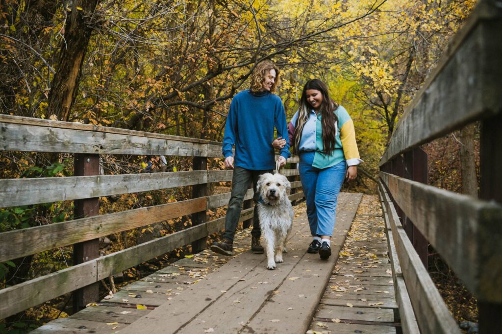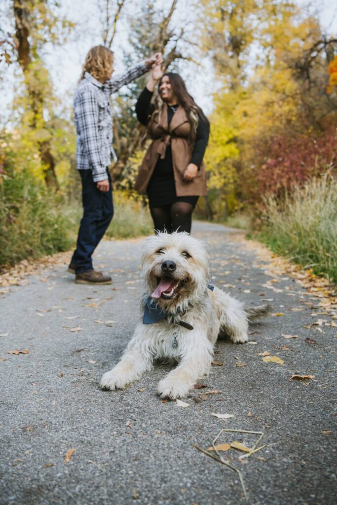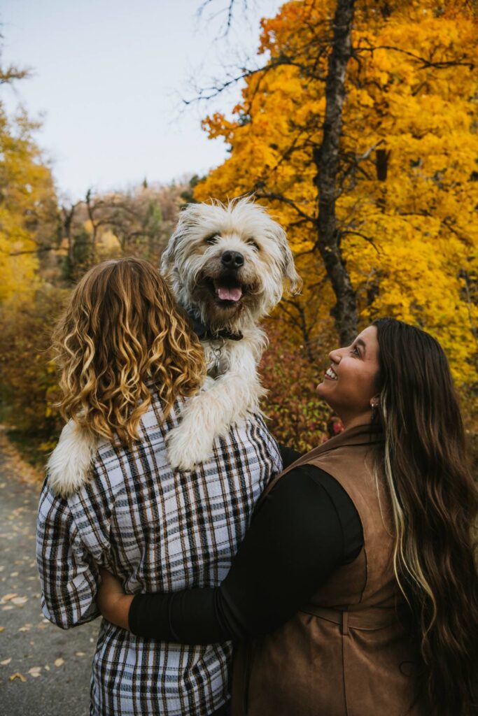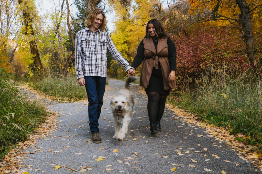 We chose Mueller Park in Bountiful, Utah for their engagement session because of its variety of backdrops, easy access to nature just outside of the main city area, and the fact that it is dog-friendly. When we arrived, we were pleasantly surprised to see so many vibrant leaves still hanging on the trees for our shoot day. Late fall is always tricky to time sessions with the perfect location to still get beautiful leaves before the trees go bare for winter.