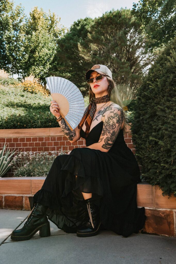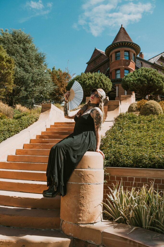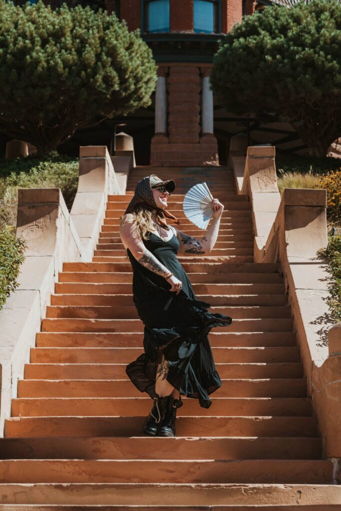 While downtown was fierce and gritty, McCune Mansion gave us space for something more fluid and playful. Angie leaned into movement by tossing the edge of her dress and waving the fan.
