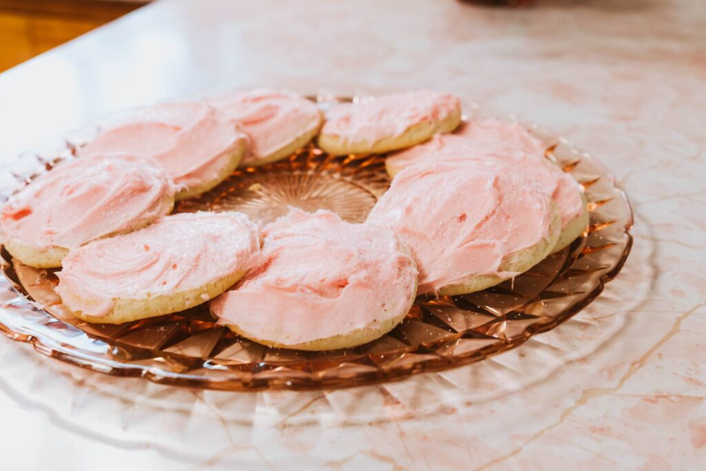Alaina wore a pink dress, cardigan, and white tights. Tyler wore a thrifted western button-down and jeans. This look tied beautifully into the vintage aesthetic of the home, especially the kitchen. The colors and textures complemented the pink accents perfectly.