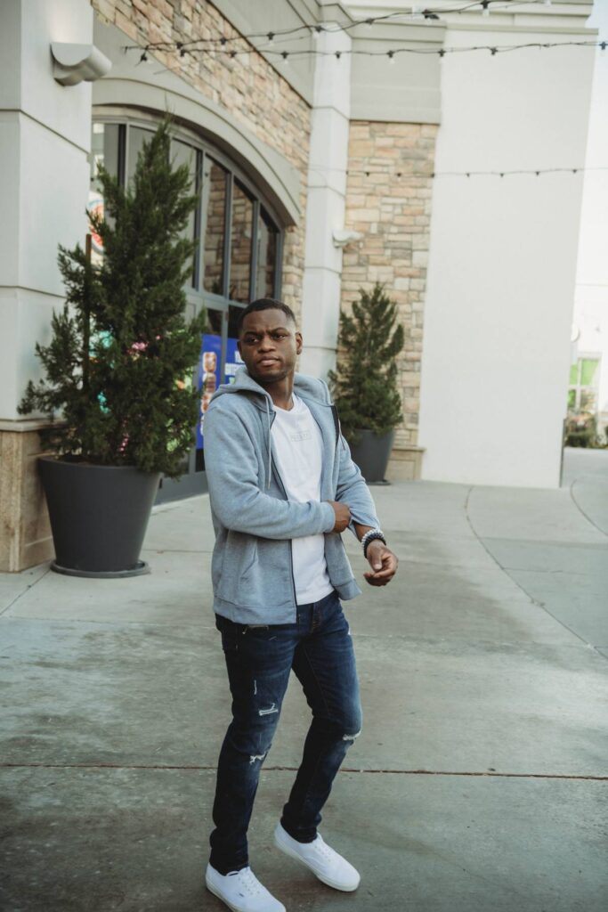 Then, for his second outfit, we leaned into stairs, red rocks, and city architecture. That look brought out something a little edgier but still natural and confident.